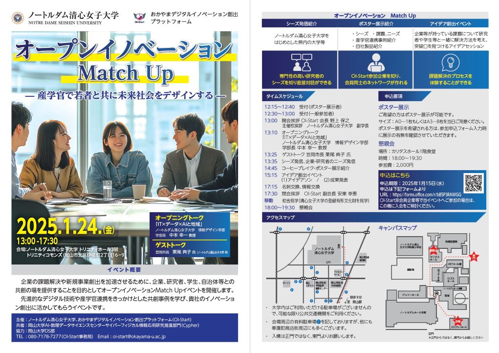 1月24日(金)に ノートルダム清心女子大学 で開催された「オープンイノベーションMatch Up Vol.2」にて,企業向けの研究シーズに関する下記の講演発表とポスター展示を行いました.