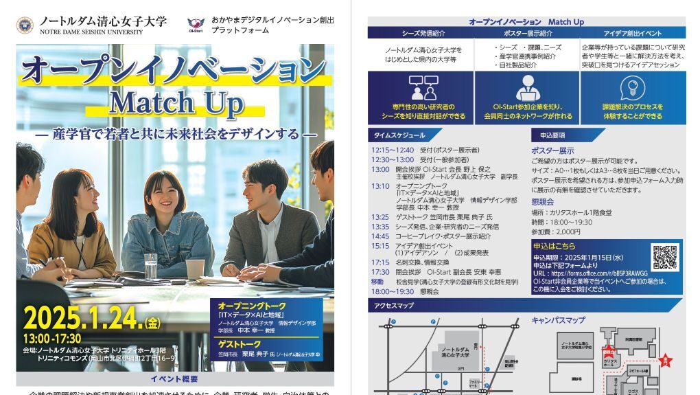 1月24日(金)に ノートルダム清心女子大学 で開催された「オープンイノベーションMatch Up Vol.2」にて,企業向けの研究シーズに関する下記の講演発表とポスター展示を行いました.