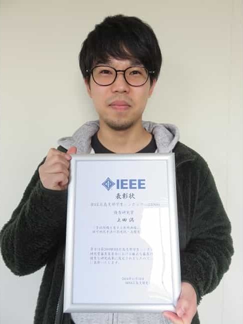 修士1年生の上田くんが「IEEE広島支部学生シンポジウム(HISS) 優秀研究賞」を受賞しました.本賞は,2018年11月17日(土)~18日(日)に鳥取大学で開催された第20回IEEE広島支部学生シンポジウムにおいて,事前の査読結果を基に研究内容および優れたポスター発表を行った学生に受賞されるものであり,上田くんは下記研究発表が評価されました.