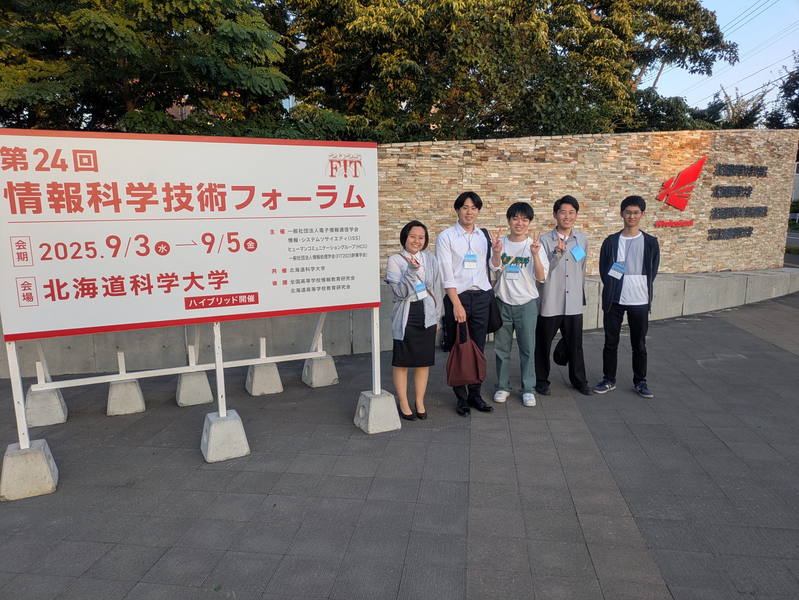 2025年9月3日(水)~5日(金)に北海道科学大学で開催された第24回情報科学技術フォーラム(FIT2025)にて,学部4年の伊藤くんと小倉くん,3年生の秋山さん(研究等プロジェクト)が下記の研究発表を行いました.また,現地およびオンライン聴講には三好くんをはじめとするOB達(2024年度卒)も応援に駆けつけてくれました.