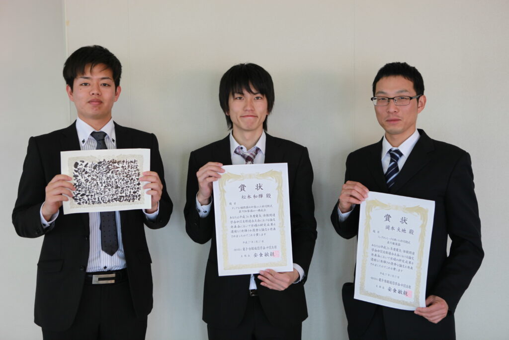未分類学部4年生の岡本くんと松本くんが「電子情報通信学会中国支部 奨励賞」を受賞しました.本賞は,2014年10月25日(土)に福山大学で開催された平成26年度電気・情報関連学会中国支部連合大会における約250件の研究発表の中から20名程度選出されるものであり,二人は下記研究発表が評価されました.