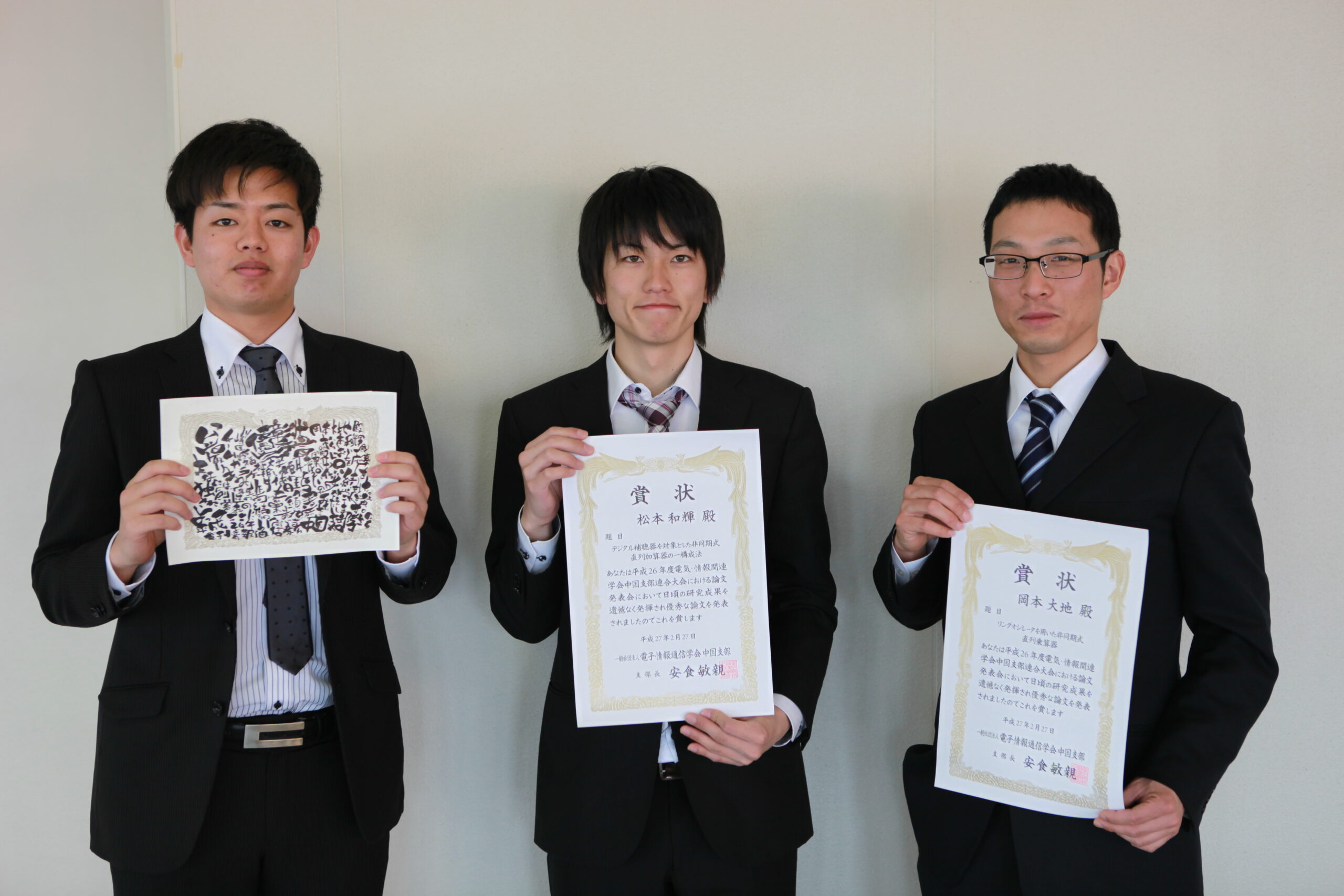 学部4年生の岡本くんと松本くんが「電子情報通信学会中国支部 奨励賞」を受賞しました.本賞は,2014年10月25日(土)に福山大学で開催された平成26年度電気・情報関連学会中国支部連合大会における約250件の研究発表の中から20名程度選出されるものであり,二人は下記研究発表が評価されました.