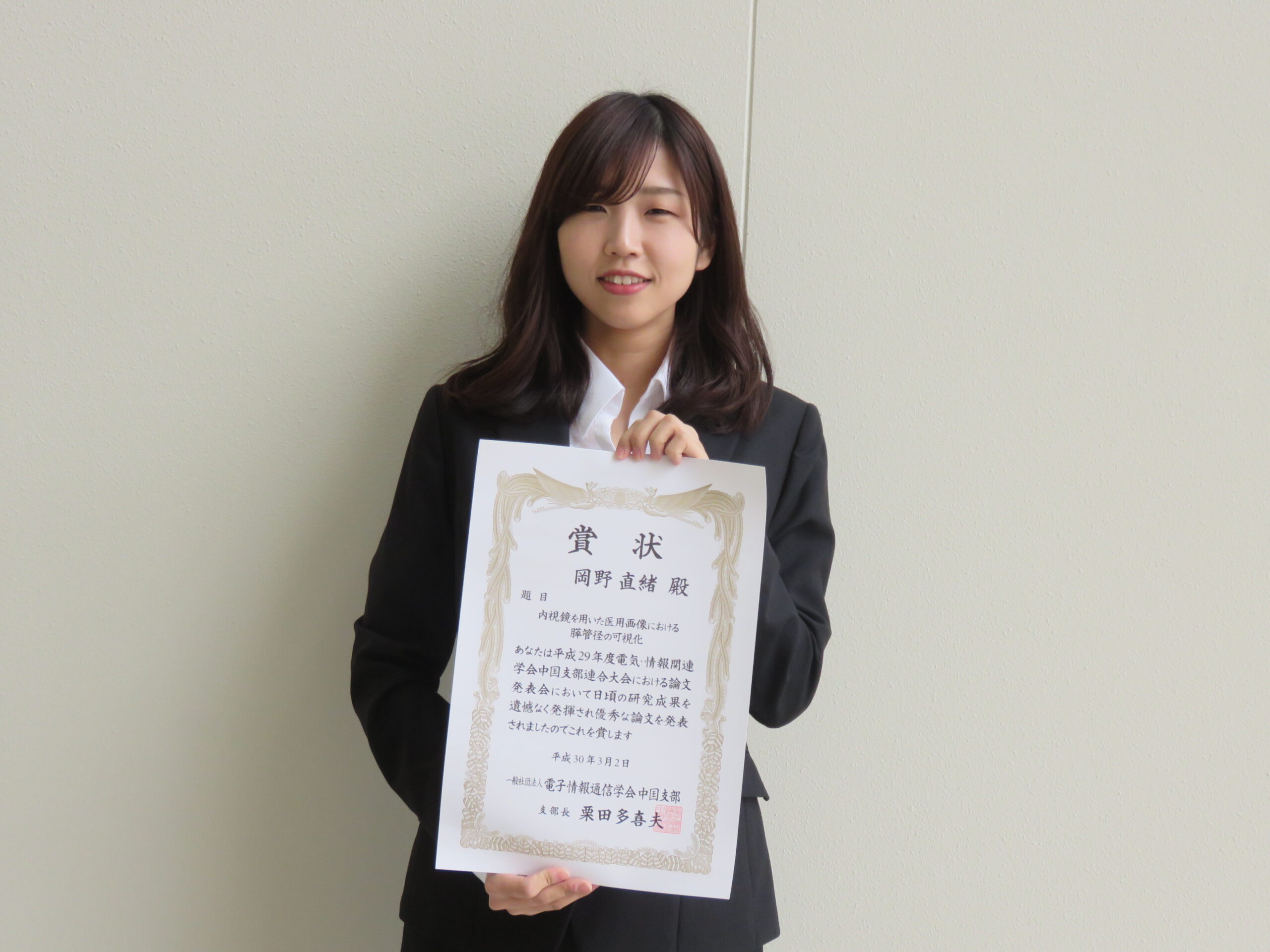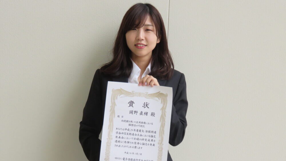 学部4年生の岡野さんが「電子情報通信学会中国支部 奨励賞」を受賞