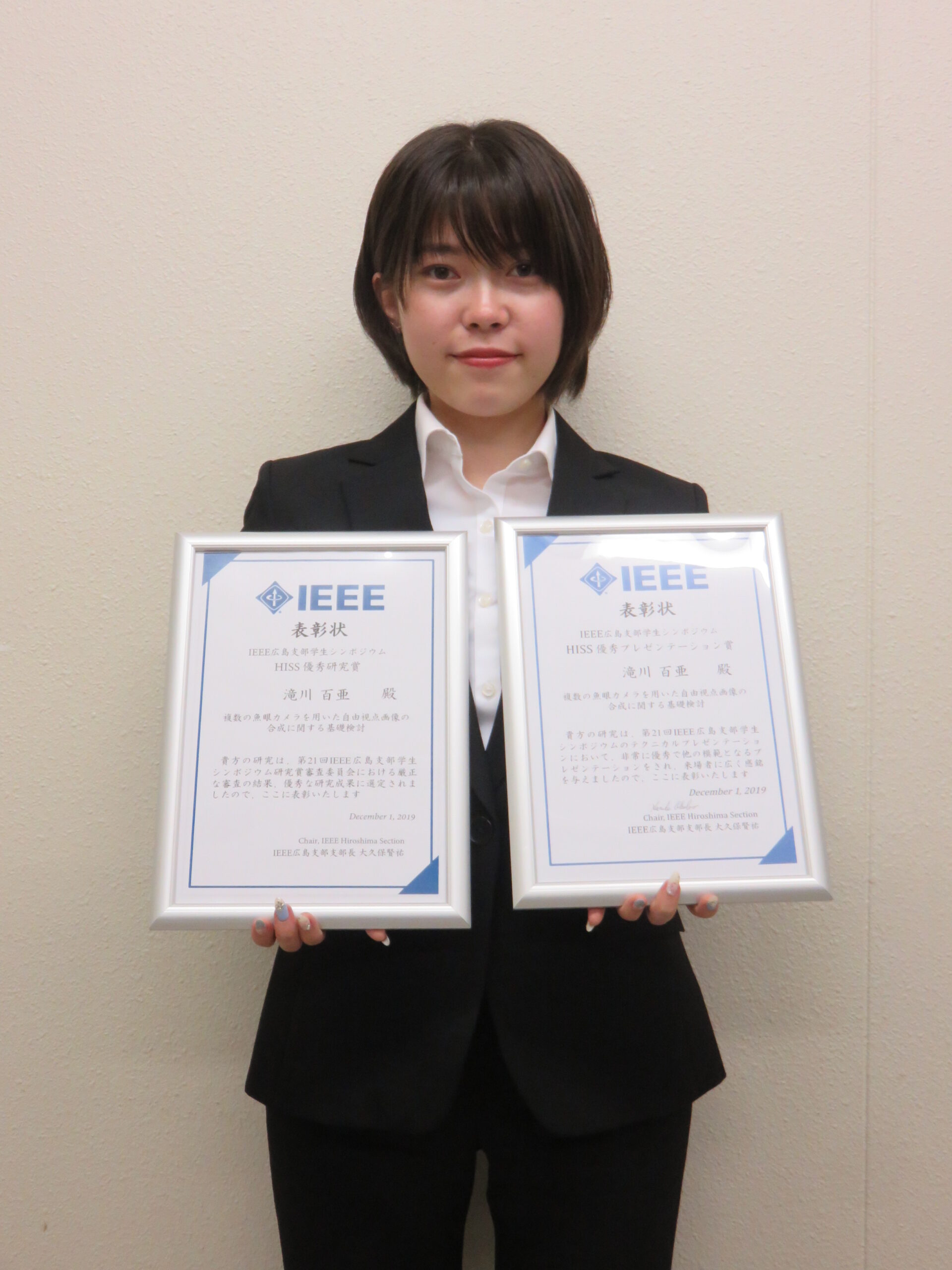 学部4年生の滝川さんが,2019年11月30日(土)~12月1日(日)に岡山県立大学で開催された第21回IEEE広島支部学生シンポジウム(HISS)において「優秀研究賞」と「優秀プレゼンテーション賞」をダブル受賞しました.優秀研究賞は事前の査読結果を基に研究内容および優れたポスター発表を行った学生に,優秀プレゼンテーション賞は当日の来場者の投票を基に今回は約150件の発表の中から上位6名に,それぞれ受賞されました.