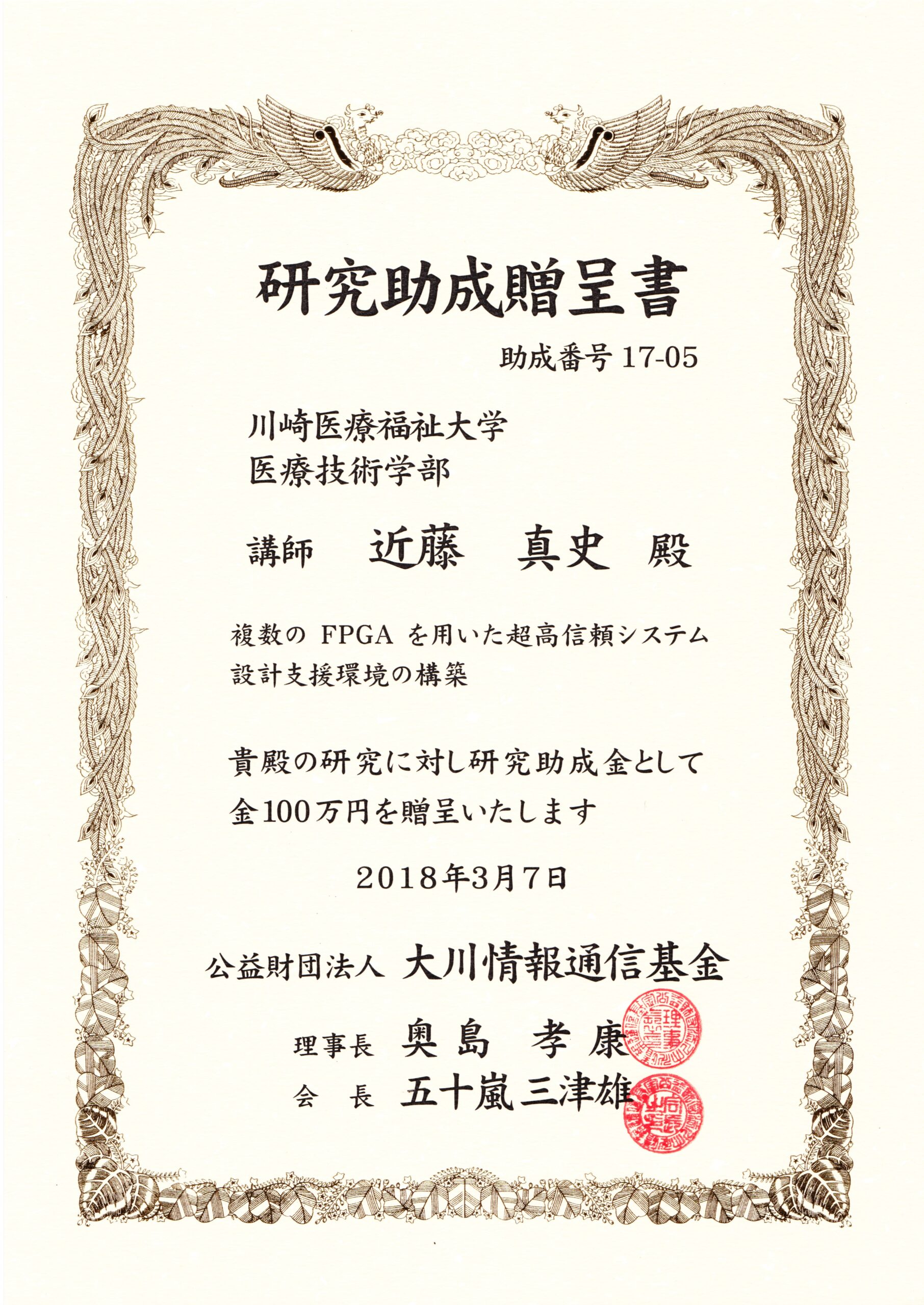 本研究室の下記研究課題が公益財団法人大川情報通信基金の2017年度研究助成に採択されました.本研究助成は,情報通信分野において独創性のある先進的または社会的に有用な調査・研究に対して助成されるものであり,2017年度は総申請課題277件の中から25件が採択され(採択率9%),2018年3月7日(水)にANAインターコンチネンタルホテル東京で贈呈式が執り行われました.