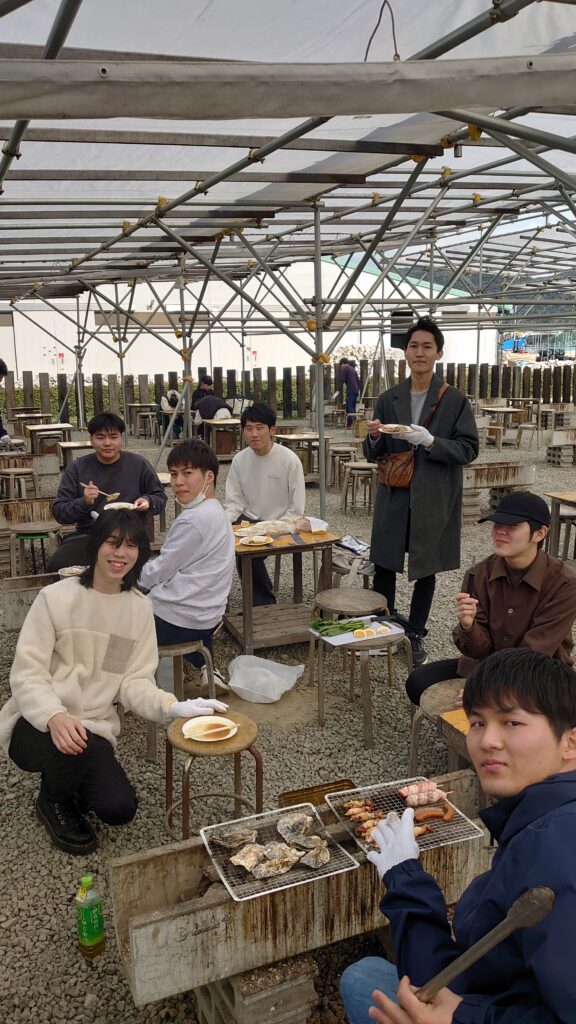 今回も研究室の学生だけでなく,研究等プロジェクトで研究室で活動をしている2年と3年生も参加し,隣接する日生漁港で水揚げされた牡蠣と海産物を炭火で焼いて,冬の味覚を堪能しました!